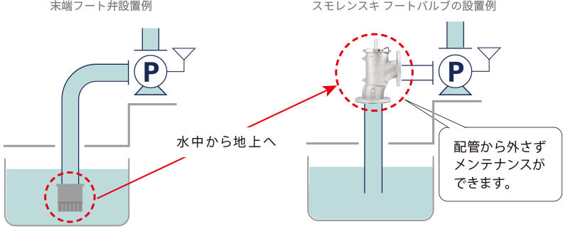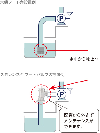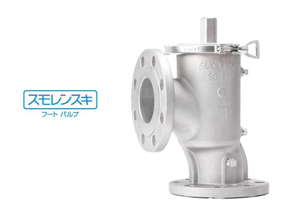 *地上設置型フートバルブは、「地上型フートバルブ」、「地上型フート弁」、「アングルチャッキ弁」といった名称で呼ばれることがあります。業界で初めて地上への設置を可能にしたフートバルブ(フート弁)が、スモレンスキ グランドフートバルブです。