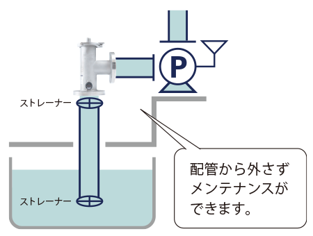 末端フート弁のメンテナンスには、吊り上げや水槽内の水を抜く等の手間が必要ですが、フートバルブは地上設置なので簡単に取り外しができます。